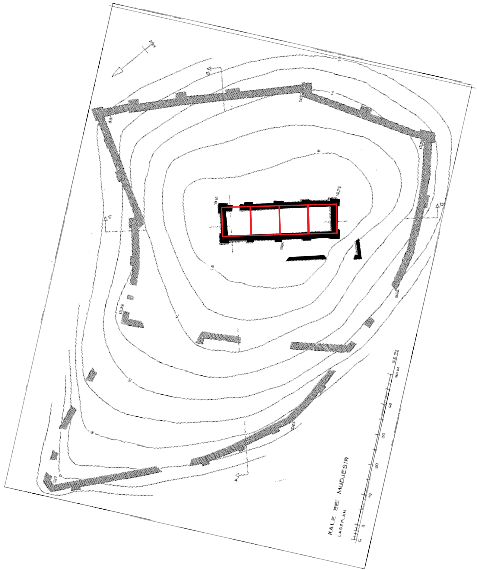 The first question of Qalat Mudjesir’s possible identity as a susi temple runs against the conspicuous difference between its rectangular plan and the square plans of susi temples. The temple's measurements and positioning of its buttressing are consistent with a unique “quad-style susi” temple, a hence undocumented style of Urartian architecture. Qalat Mudjesir’s Central Building measures approximately 40 m x 13 m, with walls approaching 2 m in thickness. Overlaying a hypothetical square susi temple with 10 m long sides over each quartet of buttresses nearly perfectly aligns with the Central Building of Qalat Mudjesir (Figure 7.15). Effectively, this arrangement of buttresses is four susi temples connected, with the adjacent walls removed. Intriguingly, this suggests the single off-center door continued the traditional susi layout, but the northern square served as the entrance for the remaining three susi layouts. Thus, rather than one susi temple, the structure was four times the size but followed the architectural design of the archetypical structures across Urartu. Reasonings for the four-part temple structure or possible uses are completely speculative and will require further research. Apart from the unique quad-style susi layout, the building exhibits the typical features of a large stone foundation supporting mudbrick walls, buttressing, and an outer wall delimiting the temple complex. In addition, all of the known susi temples were on hills or mountains, visible from some distance away (Çilingiroglu 2012, 295). While the rest of the site remains unexcavated, the scale of the outer fortification wall and the Central Building’s relative placement are similar to the susi temple at Altintepe.